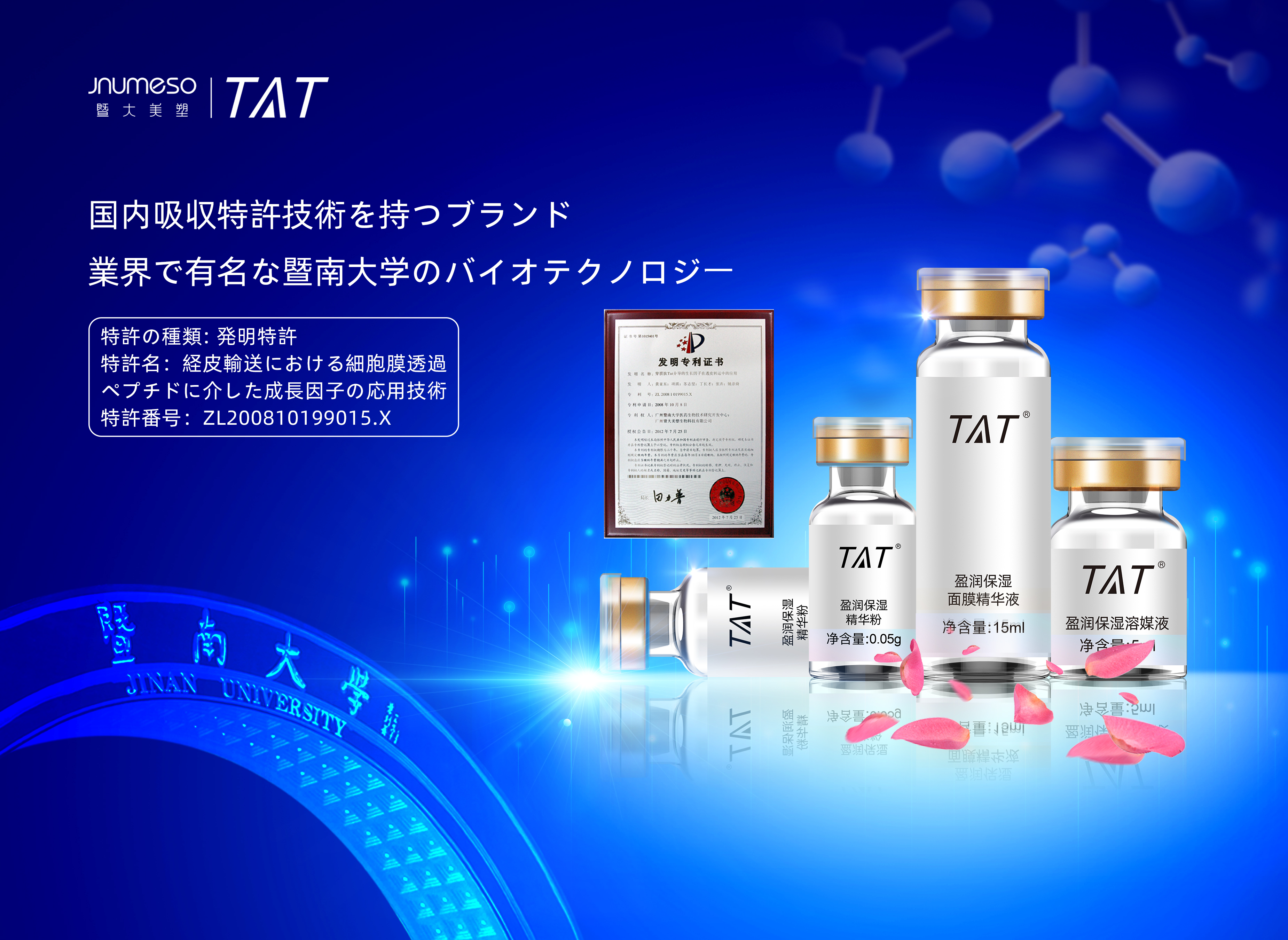 TATブランド:TATは小分子細胞膜透過ペプチド( Trans- Activator Of Transcription)の略称、2009年、暨南大学医学生物工学研究センターは、経皮輸送における膜透過性ペプチドに介した成長因子の応用技術を発明し、広州曁大美塑生物科学技術有限会社と共同で特許を申請し、TATをアンチエイジングブランドとして登録した。遺伝子工学薬物国家工程研究センター産業学習研究模範基地の強力的な研究開発能力に基づいて、TATは国内の美容家にとって人気のあるアンチエイジングブランドの1つになった。TATブランドは美しさを守りたいあなたに時間の流れと歳月の経ちを忘れさせる。